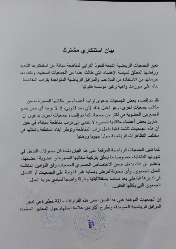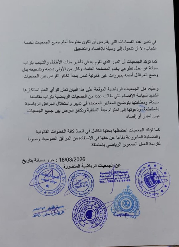 كما شددت الجمعيات على احتفاظها بحقها الكامل في اتخاذ كافة الخطوات القانونية والنضالية المشروعة دفاعا عن حقها في الاستفادة من المرافق العمومية وصونا لكرامة العمل الجمعوي الرياضي بالمنطقة.